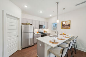 Interior features include quartz countertops, stainless steel appliances, designer cabinetry, plank flooring, and in-home washers and dryers, offering a clean and refined living environment that balances style and everyday practicality.